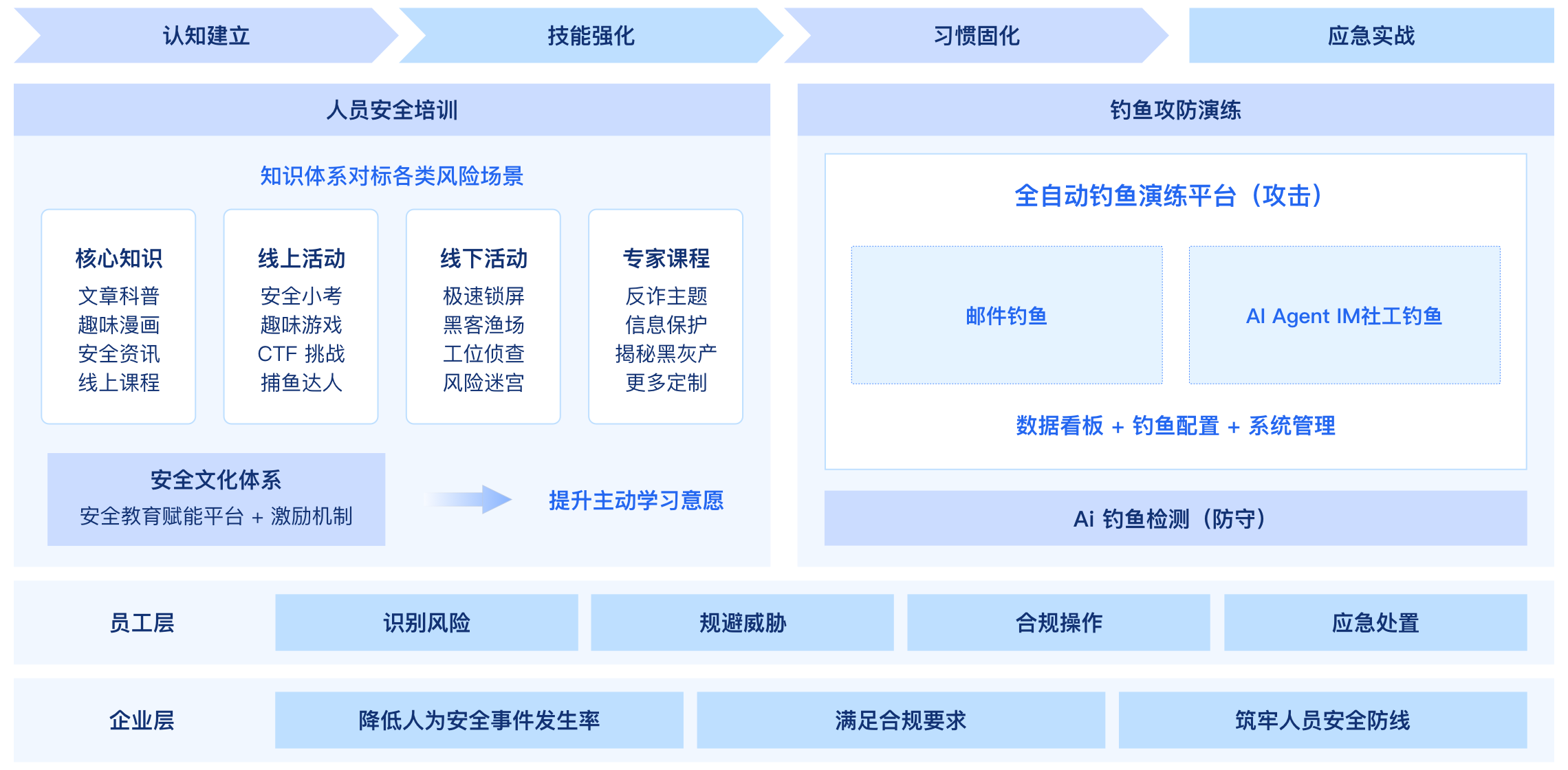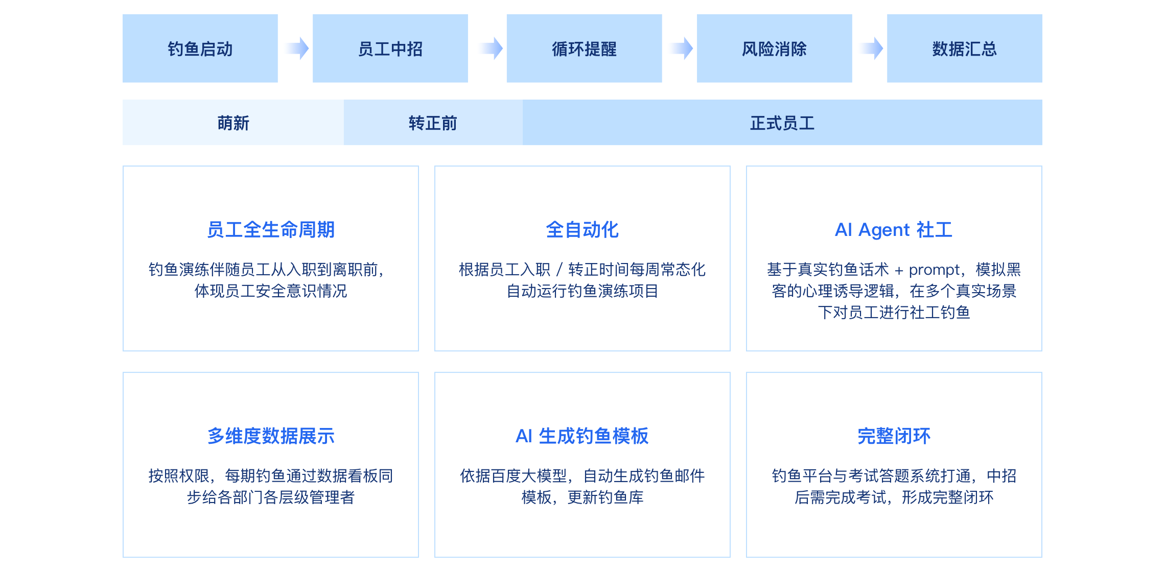 依托百度安全大模型实践总结,从员工全生命周期出发,覆盖钓鱼演练、安全培训、意识考核、AI 钓鱼等关键阶段,形成闭环保障。