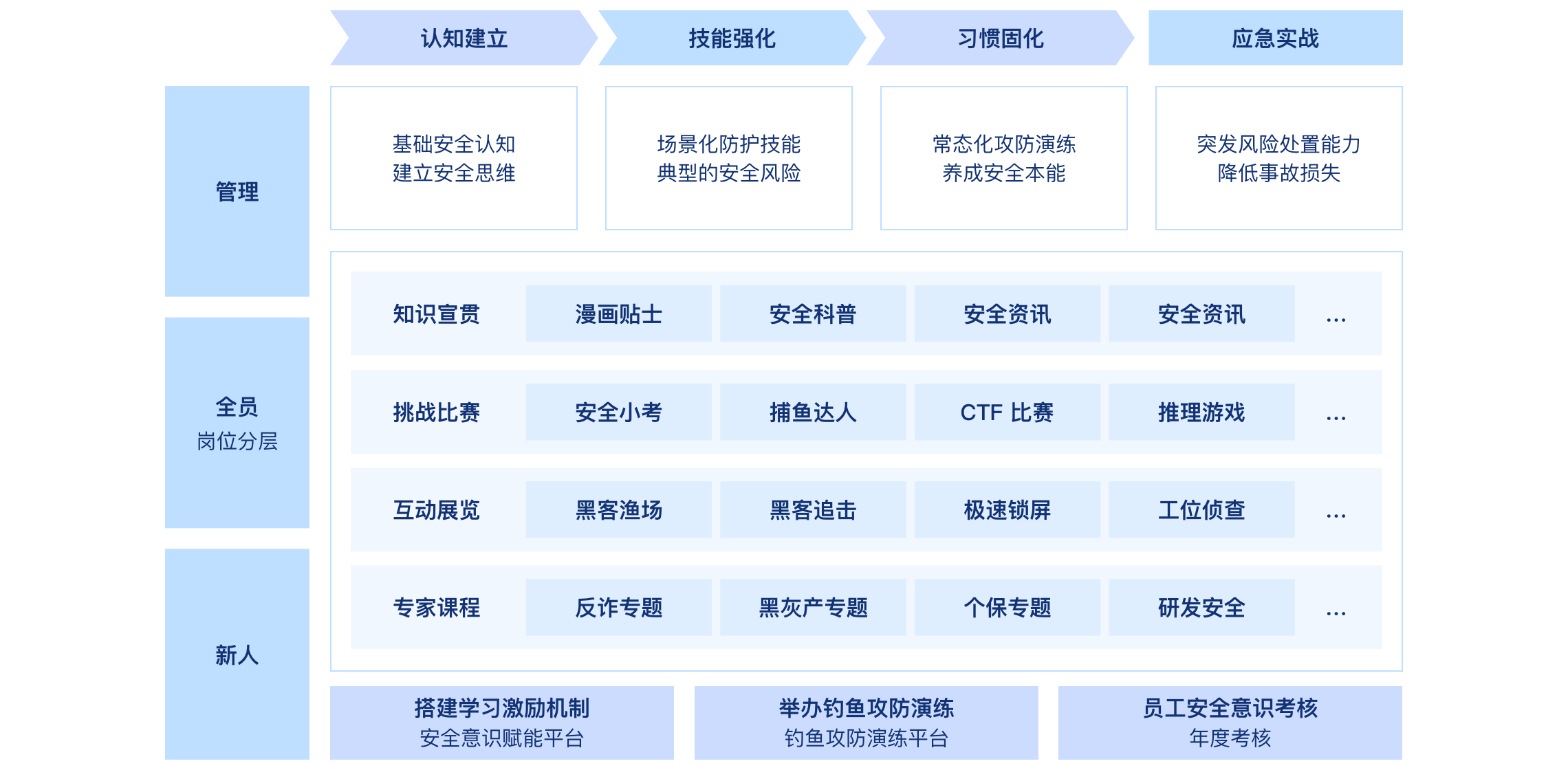 适用于新员工入职、全体员工及年度安全能力提升,通过线上课程 + 线下专家课,覆盖各类安全风险、钓鱼攻击识别等知识,帮员工快速建立安全认知,适配企业全员覆盖需求。